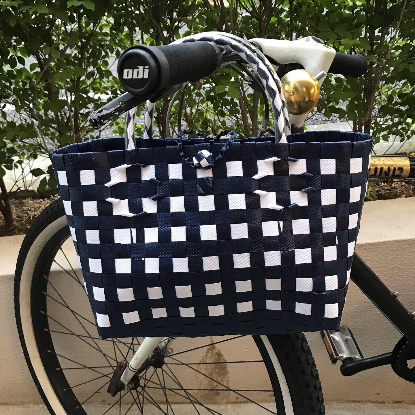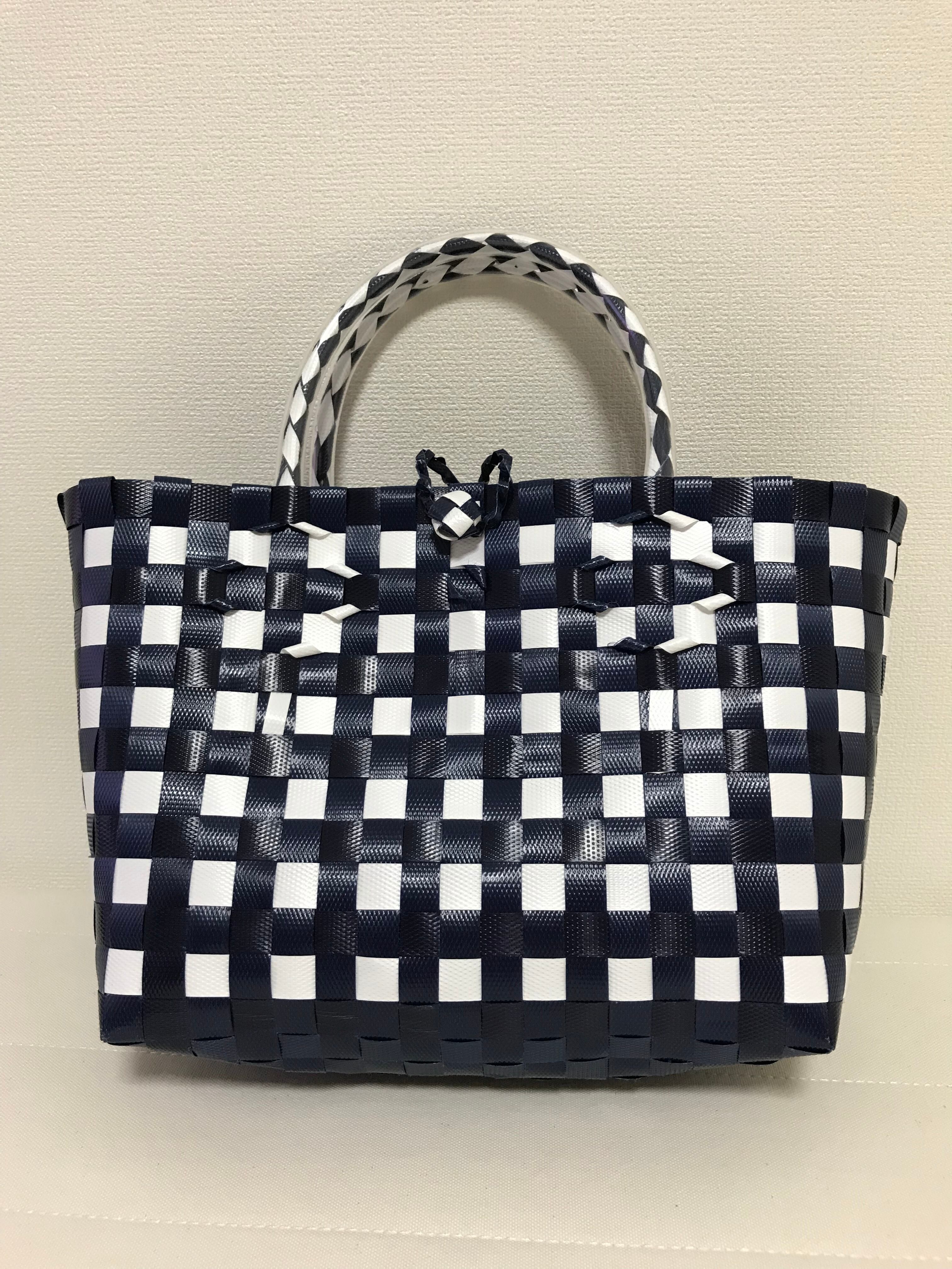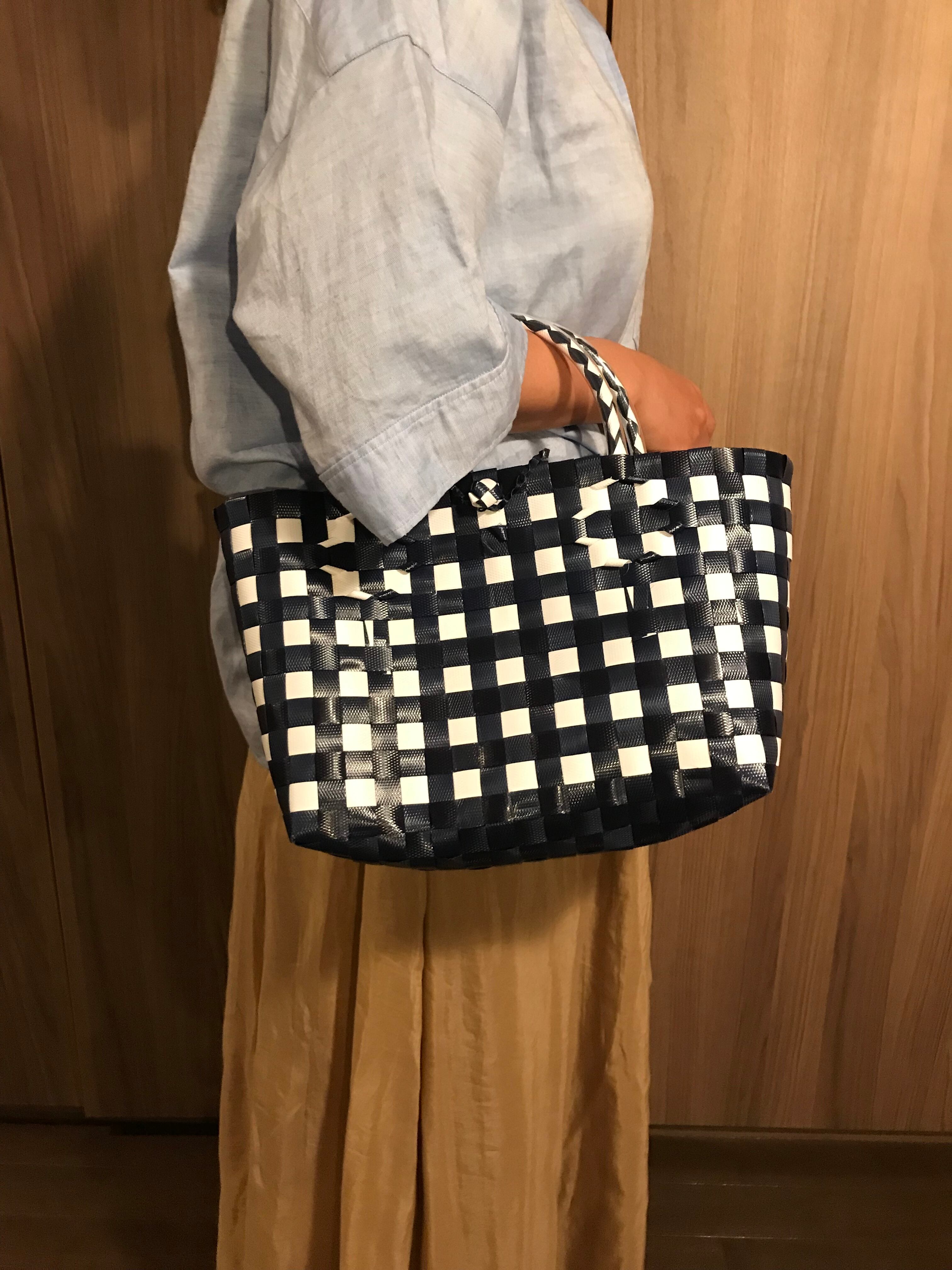 丈夫なプラスチックのバンドで手作りされた、可愛いバッグです。